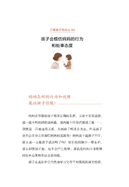 了解孩子的内心 04 孩子会模仿妈妈的行为 和处事态度 妈妈怎样的行为和说教 能让孩子信服? 妈妈希望教给孩子很多正确的东西,方法主要是说教, 说一遍不听的话就说两遍,说两遍不听的话就说三遍……, 即使说一百遍也没关系,直到孩子听进去为止。但是孩子 是否会百分之百相信妈妈的说教呢?妈妈说十遍孩子不听, 那么说一百遍孩子就会听了吗?如果妈妈缺少一样东西, 那么即使说千遍,也不会产生效果。那就是妈妈以身作则 的处事态度和非语言的沟通。 孩子在成长中会自然地学习父母平时展现的真实模样,