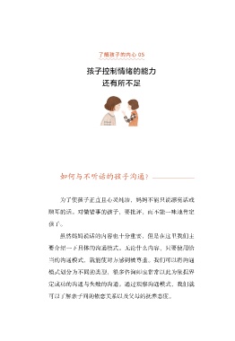 了解孩子的内心 05 孩子控制情绪的能力 还有所不足 如何与不听话的孩子沟通? 为了使孩子正直且心灵纯洁,妈妈不能只说漂亮话或 顺耳的话。对做错事的孩子,要批评,而不能一味地肯定 孩子。 虽然妈妈说话的内容也十分重要,但是在这里我们主 要介绍一下具体的沟通模式。无论什么内容,只要使用恰 当的沟通模式,就能使对方感到被尊重。我们可以将沟通 模式划分为不同的类型,很多咨询师也常常以此为依据界 定成功的沟通与失败的沟通。通过观察沟通模式,我们就 可以了解亲子间的依恋关系以及父母的抚养态度。