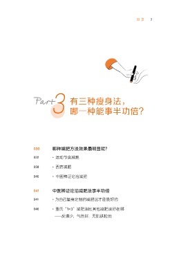 目 录 3 有三种瘦身法, 哪一种能事半功倍? 030 哪种减肥方法效果最明显呢? •运动节食减肥 032 038 •西药减肥 040 •中医辨证论治减肥 041 中医辨证论治减肥法事半功倍 041 •为自己量身定制的减肥法才是最好的 046 • 董氏 “1+3” 减肥法比其他减肥法好在哪 ——反弹少、气色好、无肌肤松弛