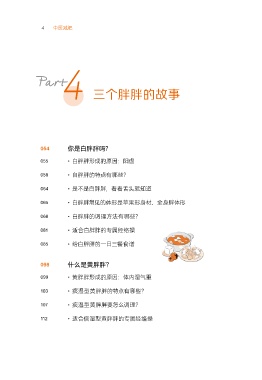4 中医减肥 三个胖胖的故事 054 你是白胖胖吗? 055 •白胖胖形成的原因:阳虚 058 •白胖胖的特点有哪些? 064 •是不是白胖胖,看看舌头就知道 065 • 白胖胖常见的体形是苹果形身材、全身胖体形 068 •白胖胖的调理方法有哪些? 081 •适合白胖胖的专属经络操 085 •给白胖胖的一日三餐食谱 098 什么是黄胖胖? • 黄胖胖形成的原因:体内湿气重 099 103 •痰湿型黄胖胖的特点有哪些? 107 •痰湿型黄胖胖要怎么调理? •适合痰湿型黄胖胖的专属经络操 112