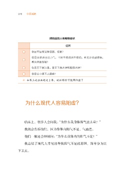 016 中医减肥 脾阳虚的人有哪些症状 症状 你是否经常觉得很困、很累? 你是否讲话也没力气,平时不想说话不想动,看见沙发就想坐, 看见床就想躺? 你是否下肢沉重,甚至下肢水肿和脸部水肿? 你是否小便不太通畅? ※ 如果上述症状超过 2 条,就证明你可能脾阳虚了 为什么现代人容易阳虚? 临床上,很多人会问我:“为什么我身体湿气这么重?” 我就会告诉他们,因为你体内阳气不足,气血差。 他们一般还会继续问:“为什么我体内的阳气不足?” 我总结了现代人常见的导致阳气不足的原因,简单分为以 下五点。