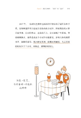 Part 2 肥胖分两种:“实胖”和“虚胖” 019 2017 年,三位研究生物钟基因的科学家获得了诺贝尔医学 奖。生物钟基因可以说是长在体内的小闹钟,控制我们的正常 昼夜节律。长时间劳动、过重的压力,会对睡眠产生影响,导 致睡眠缺乏,最终造成这个小闹钟功能紊乱,影响人体的激素 水平、新陈代谢等。我国研究发现,睡眠时间越短,尤其是睡 眠时间少于 7 小时,对体重、腰围影响很大。 熬夜 + 夜宵, 与好身材 + 好皮肤 说拜拜