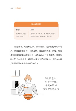 024 中医减肥 百合燕麦粥 配方: 用法: 燕麦片 100 克 把百合用水煮熟,撒上燕麦片搅匀, 百合 25 克 煮沸 5 分钟。每天早、晚分食。 百合甘寒,可清热生津、养心润肺,适合熬夜虚火旺的 人;燕麦能补益心脾,有降血糖、调血脂的作用。同时,燕麦 还可以延缓胃肠的排空时间,食用后易于产生饱腹感。美国的 《时代》杂志也认为,燕麦是减肥的天然理想食物。食用百合燕 麦粥可以缓解熬夜带来的气血亏耗。 百合降虚火, 燕麦补心脾, 常喝能补回 熬夜带来的血亏