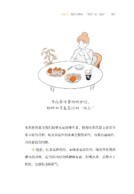Part 2 肥胖分两种:“实胖”和“虚胖” 027 常吃寒凉食物的女性, 肥胖和早衰是你的“终点” 水果虽然能为我们提供充足的维生素,但用水果代替主食是非 常不好的习惯。吃太多凉性的水果会损伤阳气,容易引起痛经、 月经紊乱等问题。 ④ 绿茶。红茶是温性的,而绿茶是凉性的。绿茶具有清热 降火的功效,适当饮用对身体健康有益,但喝太多,是弊大于 利的,会损伤身体阳气。