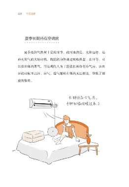 028 中医减肥 夏季长期待在空调房 夏季是阳气热量十足的时节,此时地热足,太阳也好,是 补充阳气的大好时机,我们的身体通过吸收热量、出汗等,可 以排出体内寒气。可是现代人为了舒适长期待在冷气房,该出 汗的时候不出汗,寒气、湿气郁积在体内无法排出,导致了阳 虚的体质。 长期待在冷气房, 手脚就很难暖过来了