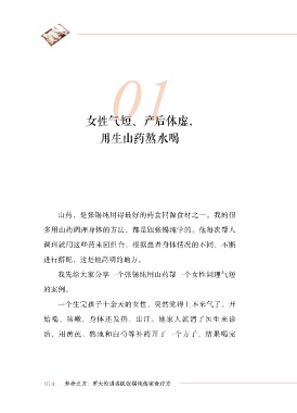 01 女性气短、产后体虚, 用生山药熬水喝 山药,是张锡纯用得最好的药食同源食材之一。我的很 多用山药调理身体的方法,都是跟张锡纯学的。他每次帮人 调理就用这些药来回组合,根据患者身体情况的不同,不断 进行搭配,这是他高明的地方。 我先给大家分享一个张锡纯用山药帮一个女性调理气短 的案例。 一个生完孩子十余天的女性,突然觉得上不来气了,开 始喘、咳嗽,身体还发热、出汗。她家人就请了医生来诊 治,用黄芪、熟地和白芍等补药开了一个方子,结果喝完 014 养命之方:罗大伦讲名医张锡纯传家食疗方