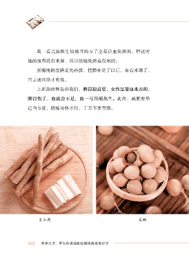 我一看之前医生给她开的方子全是活血化瘀的,但这时 她的血都没有来源,所以给她化瘀是没用的。 张锡纯的思路是先补脾,把脾补足了以后,血有来源了, 再去通经络才有效。 上面的病例告诉我们,脾胃很重要,女性是靠血来养的, 脾胃伤了,血就会不足,血一亏百病丛生。此外,减肥要靠 适当节食,锻炼身体才行,千万不要靠饿。 生山药 龙眼 022 养命之方:罗大伦讲名医张锡纯传家食疗方