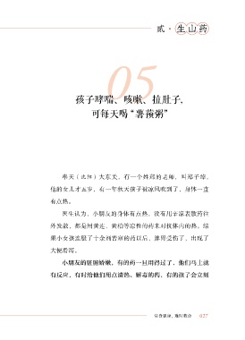 贰 生 山药 05 孩子哮喘、咳嗽、拉肚子, 可每天喝“薯蓣粥” 奉天(沈阳)大东关,有一个姓郑的老师,叫郑子绰, 他的女儿才五岁,有一年秋天孩子被凉风吹到了,身体一直 有点热。 医生认为,小朋友的身体有点热,没有用辛凉表散药往 外发散,都是用黄连、黄柏等凉性的药来对抗体内的热。结 果小女孩连服了十余剂苦寒的药以后,脾胃受伤了,出现了 大便滑泻。 小朋友的脏腑娇嫩,有的药一旦用得过了,他们马上就 有反应,有时给他们用点清热、解毒的药,有的孩子会立刻 常食强身,难时救命 027