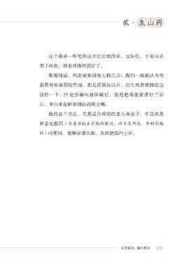 贰 生 山药 这个患者一听觉得这方法比较简单,也好吃,于是回去 用了两次,没想到腹泻就好了。 张锡纯说,鸡蛋黄有固摄大肠之功。我们一般都认为鸡 蛋黄有补真阴的作用,都是药熬好以后,把生鸡蛋黄倒里边 搅拌一下,但是张锡纯独辟蹊径,他是把鸡蛋黄煮好了以 后,拿出来捏碎和到山药粥里喝。 他的这个方法,尤其适合虚弱的老人和孩子,在莫名其 妙总是腹泻(自身功能差引起的腹泻,而不是外感、外邪引起 的)时使用,能够固摄大肠,从而把腹泻止住。 常食强身,难时救命 033