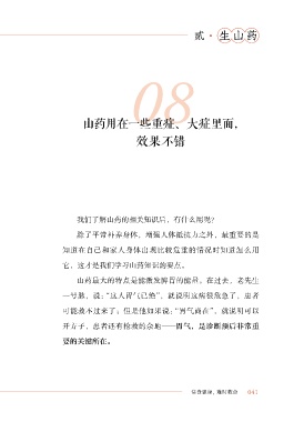 贰 生 山药 08 山药用在一些重症、大症里面, 效果不错 我们了解山药的相关知识后,有什么用呢? 除了平常补养身体,增强人体抵抗力之外,最重要的是 知道在自己和家人身体出现比较危重的情况时知道怎么用 它,这才是我们学习山药知识的要点。 山药最大的特点是能激发脾胃的能量。在过去,老先生 一号脉,说:“这人胃气已绝”,就说明这病很危急了,患者 可能救不过来了;但是他如果说:“胃气尚在”,就说明可以 开方子,患者还有抢救的余地——胃气,是诊断预后非常重 要的关键所在。 常食强身,难时救命 041