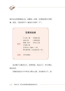 就回老家找张锡纯医治。张锡纯一诊脉,发现他的脉非常微 细,就说,“我给你开个玉液汤方子调补一下”。 玉液汤加减 生山药一两 生黄芪五钱 知母六钱 山萸肉五钱 葛根一钱半 五味子三钱 配方 天花粉三钱 生鸡内金(捣细)二钱 野台参四钱(山西党参的一种) 功效 治疗消渴症。 患者喝了几服药以后,效果明显,渴止住了,但小便次 数还是多。 张锡纯就说方子里再加山萸肉五钱,用来稳固元气、滋 044 养命之方:罗大伦讲名医张锡纯传家食疗方