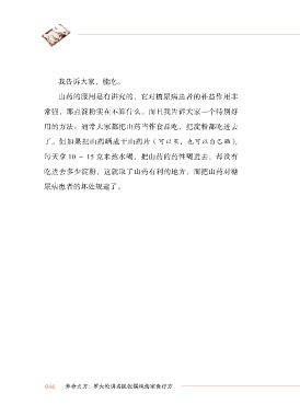 我告诉大家,能吃。 山药的服用是有讲究的,它对糖尿病患者的补益作用非 常强,那点淀粉实在不算什么。而且我告诉大家一个特别好 用的方法:通常大家都把山药当作食品吃,把淀粉都吃进去 了。但如果把山药晒成干山药片(可以买,也可以自己晒) , 每天拿 10 ~ 15 克来熬水喝,把山药的药性喝进去,却没有 吃进去多少淀粉,这就取了山药有利的地方,而把山药对糖 尿病患者的坏处规避了。 046 养命之方:罗大伦讲名医张锡纯传家食疗方