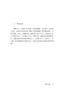 二、平王东迁 到幽王时,大局已不可收拾。他贪婪腐败,不问政事,重用佞 巧之徒,引起国人强烈不满。周幽王为取悦褒姒,数举骊山烽火,失 信于诸侯。结果,又废嫡立庶,废除申后及太子宜臼,立褒姒为后及 其子伯服为太子,并加害太子宜臼,致使申侯、缯侯和犬戎各部攻宗 周。周幽王被犬戎兵杀死于骊山之下,公元前 771 年,西周灭亡。平 王被一部分诸侯保护或挟持东迁,从此历史的重心就由周室移到列 国了。 中国史通览 21