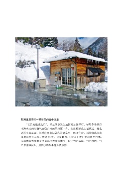 新潟县汤泽町一带常见的雪中温泉 “长长的隧道之后”,即是故事发生地新潟县汤泽町。每年冬季从日 本海吹来的湿润气流受山峰的阻挡而上升,在这里形成大量积雪,是名 副其实的雪国,同时这里也是著名的温泉乡,1934 年后,川端康成多次 来此居住并写作。历经 13 年,反复修改,《雪国》才汇集出版单行本。 这部被称为唯美主义最具代表性的作品,除了雪之洁净、雪之纯粹、雪 之璀璨和虚无,别的事物似乎都无法形容。