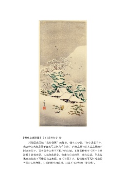 《雪中上州泽渡》 [日] 高桥松亭 绘 川端康成是被“美神眷顾”的作家。他本人曾说:“在小说家当中, 我这种人大概是属于喜欢写景色和季节的。”自然之美与艺术品之美的不 同之处在于,前者包含人类不可抗拒的力量。正如高桥松亭《雪中上州 泽渡》这幅雪景,人是如此渺小,他走向自己的家,走向生活,但永远 无法接触高不可攀的美之来源。在《雪国》中,我们随时可见川端描绘 雪景对人物身体、心灵的影响和渗透,以及不可避免的“徒劳感”。