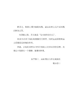 换言之,你担心哪方面的问题,就应该重点关注该问题 的解决之策。 一切预防之策,其实就是“每天的饮食方式”。 饮食方式对于我们的健康至关重要,同时也是预防疾病 方面最容易控制的事项。 因此,让我们按照本书所介绍的方式来安排饮食吧,从 现在开始拥有一个健康、强健的体魄。 医学博士、AGE 牧田专科医院院长 牧田善二