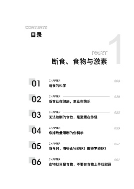 CONTENTS 目录 I 1 CONTENTS 目录 PART 断食、食物与激素 01 CHAPTER 003 断食的科学 02 CHAPTER 019 断食让你健康,更让你快乐 03 CHAPTER 025 无法控制的食欲,是激素在作怪 04 CHAPTER 039 忘掉热量限制的伪科学 05 CHAPTER 051 断食时,哪些食物能吃?哪些不能吃? 06 CHAPTER 061 食物就只是食物,不要在食物上寻找慰藉