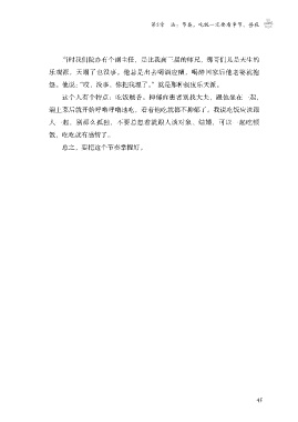 第5章 法:节奏,吃饭一定要看季节、昼夜 当时我们院办有个副主任,是比我高三届的师兄,那哥们儿是天生的 乐观派,天塌了也没事。他总是出去喝酒应酬,喝醉回家后他老婆就抱 怨。他说:“哎,没事,你把我埋了。”就是那种极度乐天派。 这个人有个特点:吃饭贼香。抑郁症患者别找大夫,跟他坐在一起, 端上菜后就开始呼噜呼噜地吃,看着他吃就都不抑郁了。我说吃饭应该跟 人一起,别那么孤独,不要总想着就跟人谈对象、结婚,可以一起吃顿 饭,吃吃就有感情了。 总之,要把这个节奏掌握好。 45