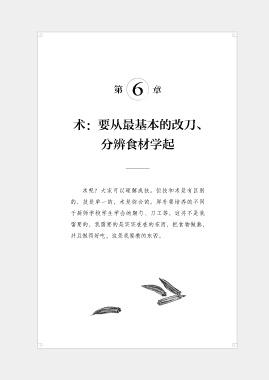 6 第 章 术:要从最基本的改刀、 分辨食材学起 术呢?大家可以理解成技。但技和术是有区别 的,技是单一的,术是综合的。厚朴要培养的不同 于厨师学校学生学会的颠勺、刀工等,这并不是我 需要的,我需要的是实实在在的东西,把食物做熟, 并且做得好吃,这是我要教的东西。