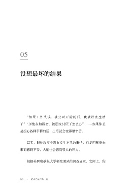05 设想最坏的结果 “如果工作失误、被公司开除的话,我就没法生活 了”“拒绝参加酒会,被朋友讨厌了怎么办”……如果你总 是担心各种事情的话,生活就会变得很辛苦。 其实,即使现实中没有发生不幸的事情,只是因预测未 来而感到不安,大脑也会感到很大的压力。 根据美国密歇根大学研究团队的调查显示,实际上,你 010 把自己放在第一位