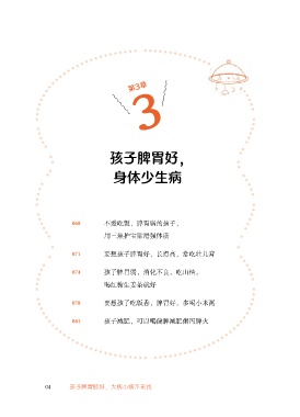 3 3 第3章 孩子脾胃好, 身体少生病 068 不爱吃饭,脾胃弱的孩子, 用三焦护宝贴增强体质 071 要想孩子脾胃好,长得高,常吃壮儿膏 074 孩子脾胃弱,消化不良,吃山楂, 喝红糖生姜茶就好 078 要想孩子吃饭香,脾胃好,多喝小米粥 081 孩子减肥,可以喝健脾减肥粥泻脾火 04 孩子脾胃肺好,大病小病不来找