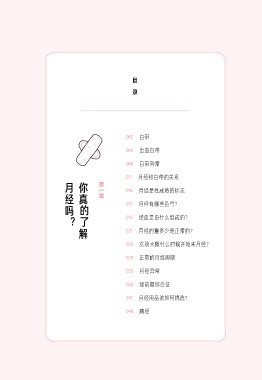 目录 002 白带 004 出血白带 006 白带异常 月经吗? 你真的了解 第一章 011 月经和白带的关系 014 月经是性成熟的标志 015 月经有哪些色号? 018 经血是由什么组成的? 021 月经的量多少是正常的? 026 女孩大概什么时候开始来月经? 029 正常的月经周期 035 月经异常 038 经前期综合征 041 月经用品该如何挑选? 049 痛经