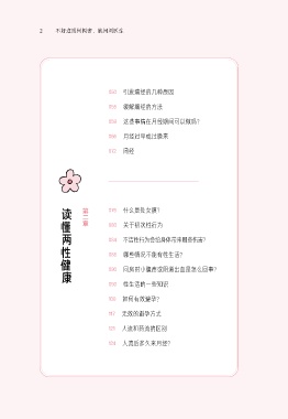2 不好意思问闺密,就问刘医生 050 引发痛经的几种原因 055 缓解痛经的方法 059 这些事情在月经期间可以做吗? 066 月经过早或过晚来 072 闭经 读懂两性健康 第二章 076 什么是处女膜? 080 关于初次性行为 084 不洁性行为会给身体带来哪些伤害? 088 哪些情况不能有性生活? 090 同房时小腹疼或阴道出血是怎么回事? 093 性生活的一些知识 100 如何有效避孕? 117 无效的避孕方式 121 人流和药流的区别 124 人流后多久来月经?