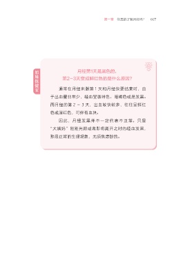 第一章 你真的了解月经吗? 017 姐妹保健室 月经第1天是黑色的, 第2~3天变成鲜红色的是什么原因? 通常在月经来潮第 1 天和月经快要结束时,由 于出血量非常少,经血呈咖啡色、暗褐色或是发黑。 而月经的第 2 ~ 3 天,出血较快较多,往往呈鲜红 色或深红色,可伴有血块。 因此,月经发黑并不一定代表不正常。只是 “大姨妈”刚刚光顾或者即将离开之时的经血发黑, 那是正常的生理现象,无须焦虑惊慌。