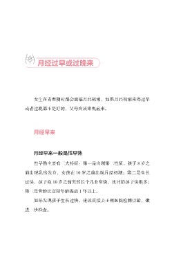 066 不好意思问闺密,就问刘医生 月经过早或过晚来 女生在青春期时都会面临月经初潮,如果月经初潮来得过早 或者过晚都不是好的,父母应该重视起来。 月经早来 月经早来一般是性早熟 性早熟主要有三大特征:第一是出现第二性征,孩子 8 岁之 前出现乳房发育,女孩在 10 岁之前出现月经初潮;第二是生长 过快,孩子在 10 岁之前突然长个儿非常快,比同龄孩子快很多; 第三是骨龄比实际年龄提前 1 年以上。 如果发现孩子生长过快,建议直接去正规医院检测骨龄,做 进一步检查。