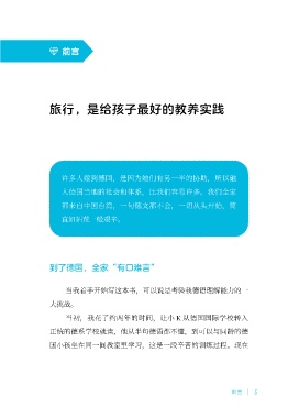 前言 旅行,是给孩子最好的教养实践 许多人嫁到德国,是因为她们有另一半的协助,所以融 入德国当地的社会和体系,比我们容易许多。我们全家 都来自中国台湾,一句德文都不会,一切从头开始,简 直如拓荒一般艰辛。 到了德国,全家“有口难言” 当我着手开始写这本书,可以说是考验我德语理解能力的一 大挑战。 当初,我花了约两年的时间,让小 K 从德国国际学校转入 正统的德系学校就读,他从半句德语都不懂,到可以与同龄的德 国小孩坐在同一间教室里学习,这是一段辛苦的训练过程。现在 前言 5