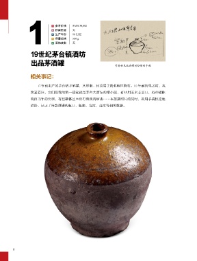 参考价格 RMB 30,000 拍 拍卖信息 无 年 生产年份 19 世纪 容 容量规格 500 g 1 酒精度数 无 度 19世纪茅台镇酒坊 出品茅酒罐 作者初见此酒罐时绘制的手稿 相关事记: 百年前出产的茅台镇茅酒罐,其形制、材质属于黔北地区特有。 年前初见之时,我 欣喜若狂,它们给我的第一感觉就是茅台大酒坛的缩小版,有些用玉米芯塞口,有些罐体 残留当年的窑泥,有些罐体甚至留有淡淡的酒香……在拍摄照片的同时,我用手稿快速地 描绘、记录了每款酒罐的瓶口、瓶底、宽度、高度等相关数据。 2