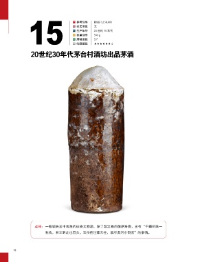 参考价格 RMB 3,150,000 拍 拍卖信息 无 年 生产年份 20 世纪 30 年代 容 容量规格 500 g 度 酒精度数 55° 15 藏 收藏星级 ★★★★★★☆ 20世纪30年代茅台村酒坊出品茅酒 点评: 一瓶辗转至中南海的珍贵文物酒,除了散发着的醇厚酱香,还有“千颗明珠一 瓮收,君王到此也低头。五岳抱住擎天柱,吸尽黄河水倒流”的豪情。 16