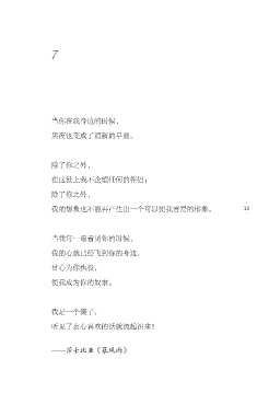 7 当你在我身边的时候, 黑夜也变成了清新的早晨。 除了你之外, 在这世上我不企望任何的伴侣; 除了你之外, 我的想象也不能再产生出一个可以使我喜爱的形象。 20 当我每一眼看见你的时候, 我的心就已经飞到你的身边, 甘心为你执役, 使我成为你的奴隶。 我是一个傻子, 听见了衷心喜欢的话就流起泪来! —莎士比亚《暴风雨》