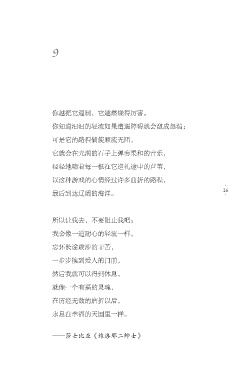 9 你越把它遏制,它越燃烧得厉害。 你知道汩汩的轻流如果遭遇障碍就会激成怒湍; 可是它的路程倘使顺流无阻, 它就会在光润的石子上弹奏柔和的音乐, 轻轻地吻着每一根在它巡礼途中的芦苇, 以这种游戏的心情经过许多曲折的路程, 26 最后到达辽阔的海洋。 所以让我去,不要阻止我吧; 我会像一道耐心的轻流一样, 忘怀长途跋涉的辛苦, 一步步挨到爱人的门前, 然后我就可以得到休息。 就像一个有福的灵魂, 在历经无数的磨折以后, 永息在幸福的天国里一样。 —莎士比亚《维洛那二绅士》