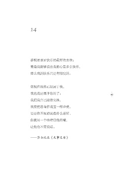 14 静默是表示快乐的最好的方法; 要是我能够说出我的心里多么快乐, 那么我的快乐只是有限度的。 您现在既然已经属于我, 我也就是属于您的了; 40 我把我自己跟您交换, 我要把您当作瑰宝一样珍爱。 要是你不知道说些什么话好, 你就用一个吻堵住他的嘴, 让他也不要说话。 —莎士比亚《无事生非》