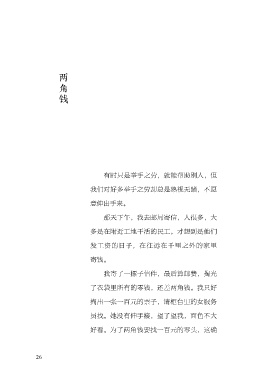 两角钱 有时只是举手之劳,就能帮助别人,但 我们对好多举手之劳却总是熟视无睹,不愿 意伸出手来。 那天下午,我去邮局寄信,人很多,大 多是在附近工地干活的民工,才想到是他们 发工资的日子,在往远在千里之外的家里 寄钱。 我寄了一摞子信件,最后算邮费,掏光 了衣袋里所有的零钱,还差两角钱。我只好 掏出一张一百元的票子,请柜台里的女服务 员找。她没有伸手接,望了望我,面色不大 好看。为了两角钱要找一百元的零头,这确 26