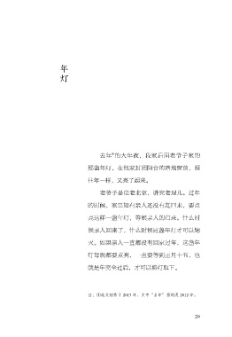 年灯 去年 的大年夜,我家后面老爷子家的 ① 那盏年灯,在他家封闭阳台的落地窗前,照 往年一样,又亮了起来。 老爷子是位老北京,讲究老理儿。过年 的时候,家里如有亲人还没有赶回来,要点 亮这样一盏年灯,等候亲人的归来。什么时 候亲人回来了,什么时候这盏年灯才可以熄 灭。如果亲人一直都没有回家过年,这盏年 灯每晚都要点亮,一直要等到正月十五,也 就是年完全过后,才可以将灯取下。 注:①此文创作于 2013 年,文中“去年”指的是 2012 年。 29