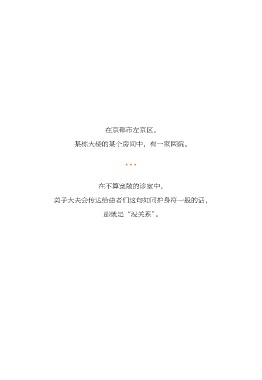 在京都市左京区, 某栋大楼的某个房间中,有一家医院。 在不算宽敞的诊室中, 英子大夫会传达给患者们这句如同护身符一般的话, 那就是“没关系”。