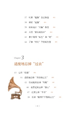 37 时常“勉强”自己休息 082 38 留好“退路” 084 39 好好地让“大脑”休息 086 40 只看“拥有的东西” 088 41 善于利用“医生”和“药” 090 42 了解“历史”孕育的智慧 092 3 Chapter 适度地忘掉“过去” 43 忘掉“经验” 096 44 适度地忘掉“美好的过去” 098 45 行动起来忘掉“失败” 100 46 也要适度忘掉“担心” 102 47 适度忘掉“不幸” 104 48 忘掉“抽到下下签的过去” 106 〔 4 〕