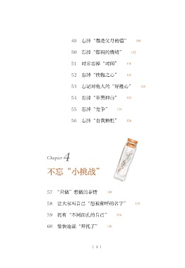 49 忘掉“都是父母的错” 108 50 忘掉“郁闷的情绪” 112 51 时常忘掉“时间” 114 52 忘掉“懊悔之心” 116 53 忘记对他人的“好胜心” 118 54 忘掉“非黑即白” 122 55 忘掉“竞争” 124 56 忘掉“自我牺牲” 126 4 Chapter 不忘“小挑战” 57 “只做”想做的事情 130 58 让大家叫自己“想被称呼的名字” 132 59 拥有“不同面孔的自己” 134 60 愉快地说“拜托了” 136 〔 5 〕