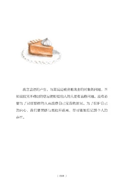 流言蜚语的产生,与其说是被责难攻击的对象的问题,不 如说仅凭不确切的信息便贬低他人的人更有品格问题。没有必 要为了讨好那样的人而浪费自己宝贵的时间。为了保护自己 的内心,我们要果断与其拉开距离,尽可能地忘记那个人的 存在。 〔 008 〕
