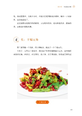 第13章 处暑南方膳 化,浸到莲藕里,大概半小时,开锅以后把网膜残渣揭掉,翻扣一下到盘 里,这道菜就成了。 这道菜既有莲藕自然的甜香,又有糯米的香,还有桂花的香、猪油的 香,这就是桂花糯米藕。 4 佐:干煸豆角 第三道菜做一个反佐,用辛辣味的。我选了一个干煸豆角。 立秋了,豆角也下来很多,我们院子里种的摘都摘不过来。这时摘回 来各种豆角,四季豆、豇豆都行,洗干净,用手掰成段。好处就是掰的过 干煸豆角 211