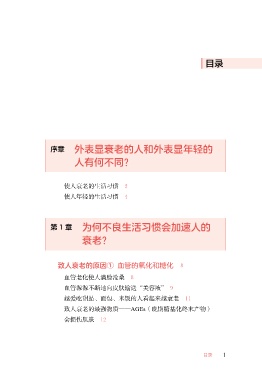 目录 序章 外表显衰老的人和外表显年轻的 人有何不同? 使人衰老的生活习惯 2 使人年轻的生活习惯 4 第1章 为何不良生活习惯会加速人的 衰老? 致人衰老的原因① 血管的氧化和糖化 8 血管老化使人满脸沧桑 8 血管源源不断地向皮肤输送“美容液” 9 越爱吃甜品、面包、米饭的人看起来越衰老 11 致人衰老的最强物质——AGEs(晚期糖基化终末产物) 会损伤肌肤 12 目录 1
