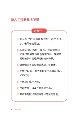 使人年轻的生活习惯 饮食…… 1 肚子饿了以后不着急吃饭,而是先喝 水,做简单的运动。 2 饮用无糖的咖啡、红茶,经常喝绿茶。 如果是瓶装饮料则选择茶饮料,如果不 是瓶装饮料就选择无糖的水和茶。 3 早餐喝含有新鲜蔬菜水果的果蔬汁。 4 吃饱了以后,即使有剩菜也不强迫自己 必须吃光。 5 一天至少吃一次鱼。 6 常吃大豆,以及豆腐等豆制品。 7 养成饭后散步或原地踏步的运动习惯。 4 抗老生活