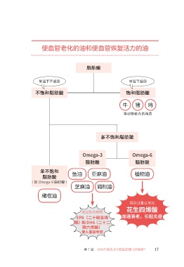 使血管老化的油和使血管恢复活力的油 脂肪酸 常温下不凝固 常温下凝固 不饱和脂肪酸 饱和脂肪酸 牛 猪 鸡 等动物体内的脂质 多不饱和脂肪酸 Omega-3 Omega-6 脂肪酸 脂肪酸 单不饱和 脂肪酸 鱼油 亚麻油 植物油 (如 Omega-9 脂肪酸) 芝麻油 调和油 橄榄油 摄取过量会增加 通过抗炎物质 花生四烯酸 EPA(二十碳五烯 加速衰老,引起炎症 酸)和 DHA(二十二 碳六烯酸) 使人重返年轻 第1章 为何不良生活习惯会加速人的衰老? 17