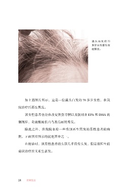 满头白发的 70 多岁女性重生浓 密黑发。 如上面照片所示,这是一位满头白发的 70 多岁女性,在我 院治疗后再生黑发。 该女性患者也是在改变饮食习惯以及服用含 EPA 和 DHA 的 制剂后,奇迹般地长出乌黑亮丽的秀发。 除此之外,在我院也有一些秃顶再生黑发的男性患者的病 例。下面照片所示的就是其中之一。 在初诊时,该男性患者的头顶几乎没有头发,但是按医生的 建议治疗后又重生新发。 24 抗老生活