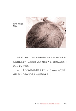 秃顶的男性再生 黑发。 上述两个案例中,两位患者都是通过恢复血管的弹性来改善 头皮的血液循环,进而使得毛根细胞恢复活力,抑制头皮发炎, 这正是治疗的关键。 另外,我们不仅可以从制剂中摄入 EPA 和 DHA,也可以通 过服用保健品或食用鱼肉来达到类似的效果。 第1章 为何不良生活习惯会加速人的衰老? 25