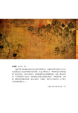 游春图 展子虔 隋 《游春图》被宋徽宗赵佶认为是展子虔的作品。这幅画代表了我国古代山水 画家描绘祖国大地的明媚春光的热忱,传达出赞美春天、赞美河山的乐观的情 感;桃花的红色,树和山的绿色,特别是溶溶春水的粼粼细波,表现了春风的和 煦,具有强烈的艺术效果。这幅画的色彩因为强调表现春山、春树的青绿,而形 成一种特有的风格和传统,被后人称为“青绿法”。展子虔《游春图》是青绿山 水的早期代表作之一。 (摘引自本书第四章第一节)