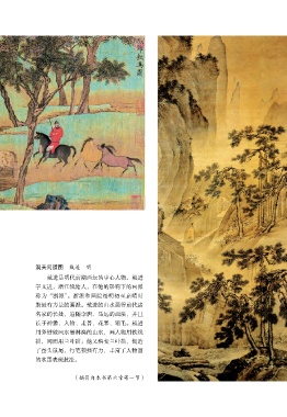 洞天问道图 戴进 明 戴进是明代前期画坛的中心人物。戴进 字文进,浙江钱塘人,在他的影响下的画派 称为“浙派”。浙派和画院是明初至嘉靖时 期最有力量的画派。戴进的山水画得前代诸 名家的长处,追随李唐、马远的画法,并且 长于神像、人物、走兽、花果、翎毛。戴进 用斧劈皴画水墨淋漓的山水,画人物用铁线 描,间而用兰叶描;他又稍变兰叶描,创造 了蚕头鼠尾,行笔顿挫有力,丰富了人物画 的水墨表现技法。 (摘引自本书第六章第一节)