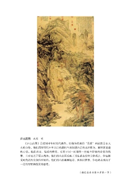 庐山高图 沈周 明 《庐山高图》是沈周中年时的代表作。以他为代表的“吴派”画家都是士大 夫的身份。他们都对明代中叶以后的腐朽生活深感自己的无所作为,而怀着退避 的心情。他们善良、懦弱的性情,有别于同一时期另一些地主阶级的贪婪和残 暴,且对比之下更显高尚;他们的山水画反映了其生活态度和美学观点,但也都 受时代的历史条件所制约。他们的山水画和短诗,虽取材狭窄,但也都表现出了 一定的情绪和真实的感受。 (摘引自本书第六章第一节)
